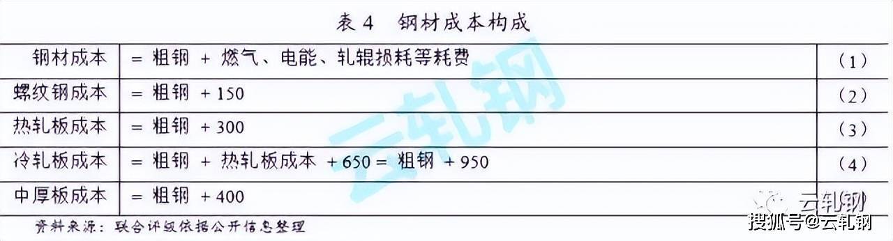 煉鋼環(huán)節(jié)所生產的粗鋼最終用于鋼材的軋制流程;因此,軋鋼過程成本主要由粗鋼構成。不同類型鋼材的軋制過程還需不同燃氣、電能、軋輥損耗等耗費;其中,螺紋鋼軋制費用約為150元/噸、熱軋板軋制費用約為300元/噸、冷軋板軋制費用約為950元/噸(冷軋流程軋制費用約為650元/噸,其前序熱軋流程軋制費用約為300元/噸)、中厚板軋制費用約為400元/噸。