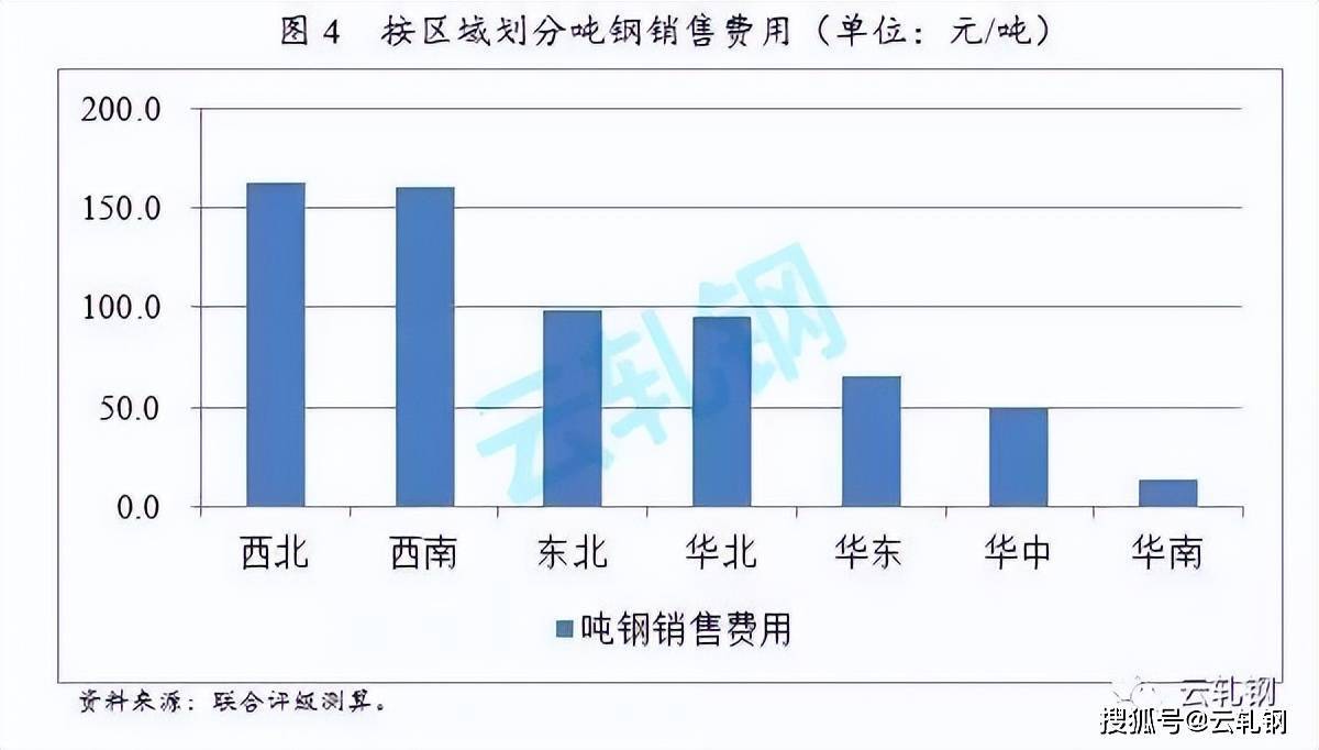 銷售過程中產生的運輸費用主要體現在銷售費用中;具體科目為:財務費用-運輸費(或運輸倉儲費)。假設運輸單價不變的情況下,運輸成本主要體現為生產地到消費地之間的距離。從我們的統計情況來看,第一梯隊,西北和西南地區(qū)噸鋼財務費用分別為162.40元/噸和160.05元/噸;第二梯隊,東北和華北地區(qū)噸鋼財務費用分別為98.19元/噸和95.38元/噸;第三梯隊,華東、華中和華南噸鋼財務費用分別為65.80元/噸、49.12元/噸和13.88元/噸。