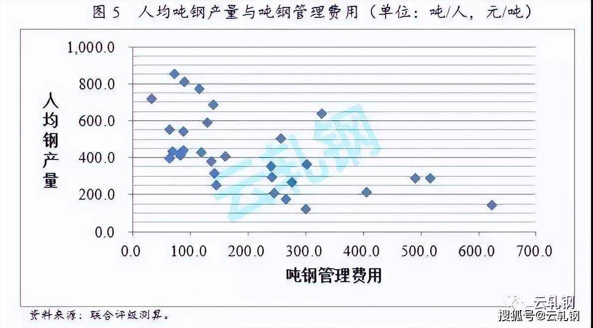 管理費用主要由職工薪酬構成,因此,噸鋼管理費用和鋼鐵企業(yè)人均噸鋼產量存在較強的負相關關系。但整體高程度分化,行業(yè)噸鋼管理費用中位數為141.47元/噸,行業(yè)噸鋼管理費用均值為203.60元/噸;存在噸鋼管理費用異常高的企業(yè)推高了行業(yè)平均水平。噸鋼管理費用處于行業(yè)前五水平的企業(yè)為攀鋼集團有限公司、酒泉鋼鐵(集團)有限責任公司、重慶鋼鐵股份有限公司、杭州鋼鐵集團公司和太原鋼鐵(集團)有限公司,其噸鋼管理費用分別為650.33元/噸、624.05元/噸、516.39元/噸、503.89元/噸和489.58元/噸。