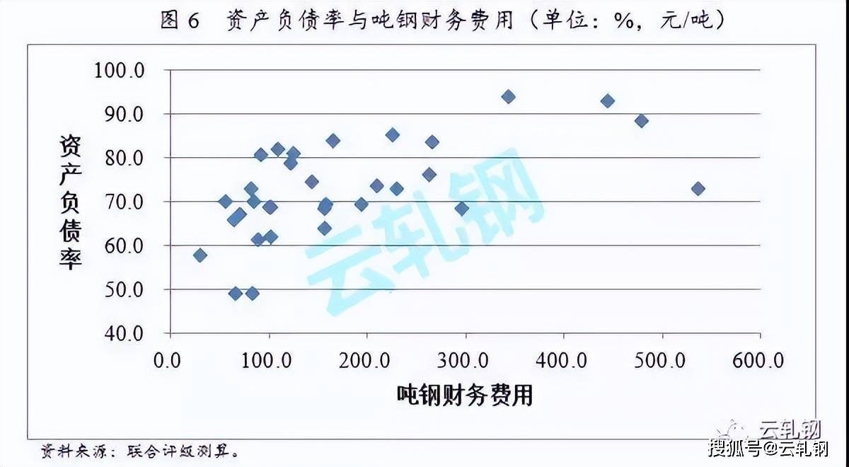 財務費用中利息支出占大頭,因此,噸鋼財務費用和鋼鐵企業(yè)的財務杠桿相關度較高。全行業(yè)來看,噸鋼財務費用中位數為134.2元/噸,平均數為176.6元/噸,噸鋼財務費用也存在受異常值推高的問題。噸鋼財務費用居于行業(yè)前五的企業(yè)分別為,酒泉鋼鐵(集團)有限責任公司、西寧特殊鋼股份有限公司、重慶鋼鐵股份有限公司、寶鋼集團新疆八一鋼鐵有限公司和太原鋼鐵(集團)有限公司,其噸鋼財務費用分別為536.26元/噸、478.19元/噸、444.66元/噸、343.60元/噸和296.71元/噸。