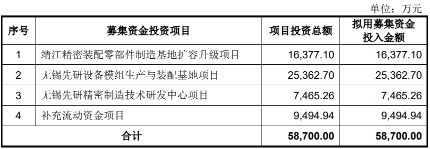 先鋒精科本次公開發(fā)行募集資金總額為57,121.76萬元,扣除發(fā)行費(fèi)用后的募集資金凈額為51,222.43萬元,公司募集資金凈額比原計(jì)劃少7,477.57萬元。先鋒精科2024年12月6日披露的招股書顯示,公司擬募集資金58,700.00萬元,用于靖江精密裝配零部件制造基地?cái)U(kuò)容升級(jí)項(xiàng)目、無錫先研設(shè)備模組生產(chǎn)與裝配基地項(xiàng)目、無錫先研精密制造技術(shù)研發(fā)中心項(xiàng)目、補(bǔ)充流動(dòng)資金項(xiàng)目。