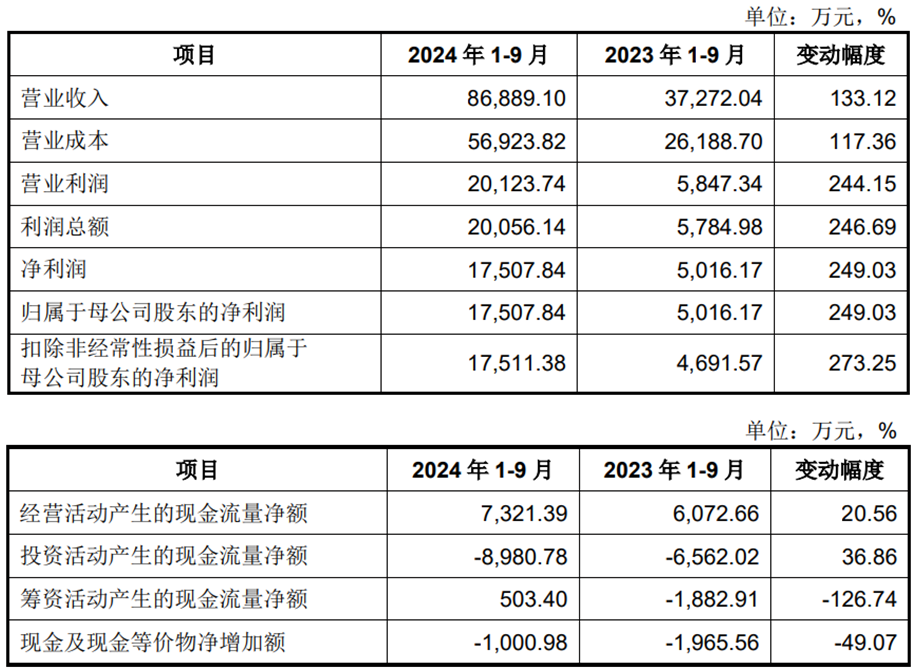 2024年1-9月,先鋒精科實(shí)現(xiàn)營(yíng)業(yè)收入86,889.10萬元,同比增長(zhǎng)133.12%;實(shí)現(xiàn)凈利潤(rùn)/歸屬于母公司股東的凈利潤(rùn)17,507.84萬元,同比增長(zhǎng)249.03%;實(shí)現(xiàn)扣除非經(jīng)常性損益后的歸屬于母公司股東的凈利潤(rùn)17,511.38萬元,同比增長(zhǎng)273.25%;經(jīng)營(yíng)活動(dòng)產(chǎn)生的現(xiàn)金流量?jī)纛~7,321.39萬元,同比增長(zhǎng)20.56%。金年會(huì)官網(wǎng)