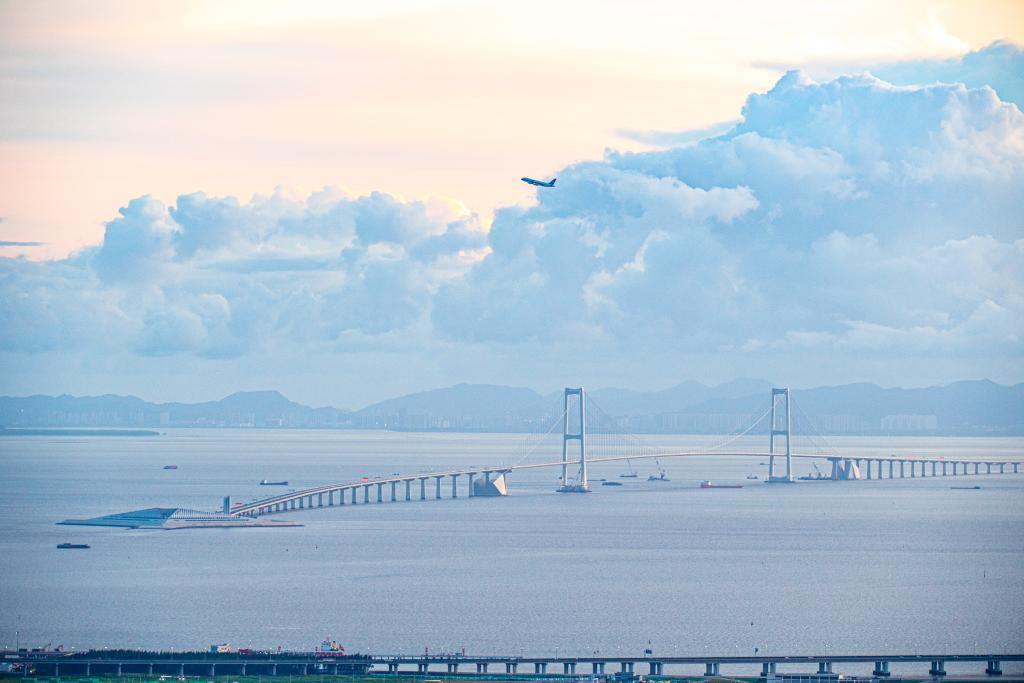 6月23日,從深圳寶安國際機場起飛的飛機飛過深中通道。新華社記者 毛思倩 攝