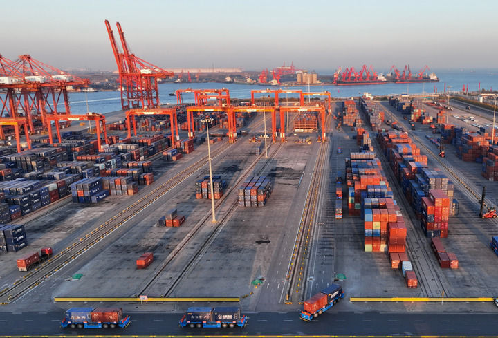 2024年11月5日拍攝的唐山港京唐港區(qū)集裝箱碼頭堆場(chǎng)(無(wú)人機(jī)照片)。新華社記者 楊世堯 攝