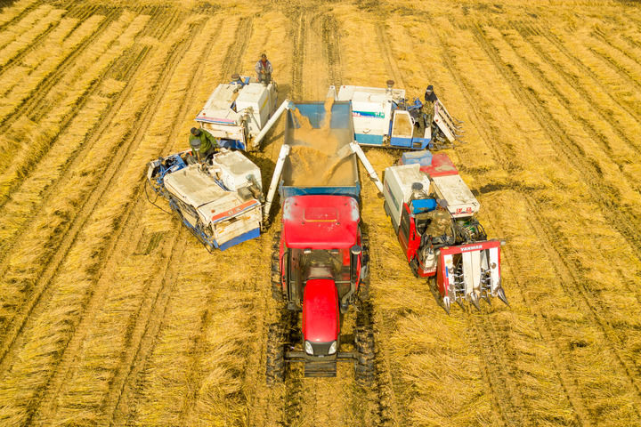 2024年10月13日,在黑龍江省綏化市北林區(qū)雙河鎮(zhèn)稻香村,村民駕駛農(nóng)機(jī)進(jìn)行卸糧作業(yè)(無(wú)人機(jī)照片)。新華社記者 張濤攝