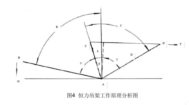 恒力吊架的工作原理可由圖4的分析說明。圖中A為主軸1、B為掛孔位置、C為彈簧力作用在荷載調節(jié)螺栓上的位置(即拉板13與其交點)、D為彈簧座在外殼上的位置。金年會官網轉動體上荷載W、彈簧力F組成以主軸A為中心的二個力矩、工作時它們大小相同反向相反